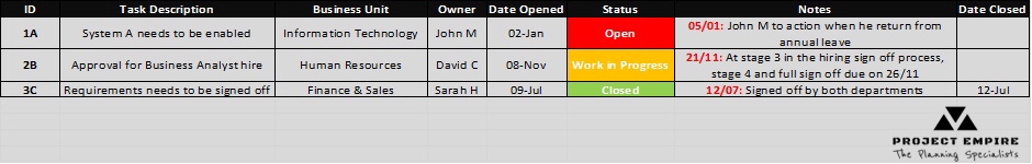 • There is no exact science so it’s whatever works for you as a Project Manager but the actions log should be clear and concise with no ambiguity on what’s needs to be done & by whom.