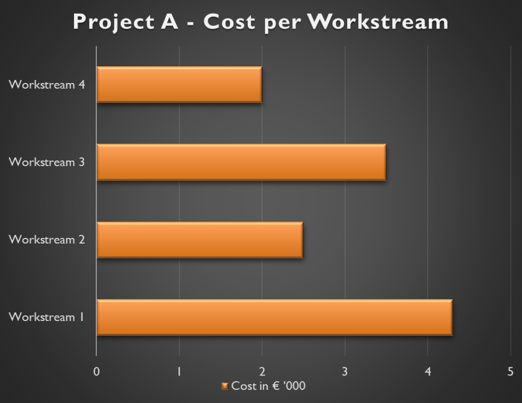 A simple example is included below depicting very simply costs incurred for project workstreams. Workstream titles are displayed on the Y-axis and cost in the X-axis. All bar charts can be jazzed up and various colours added to improve presentation and depict information in the format you deem fit.